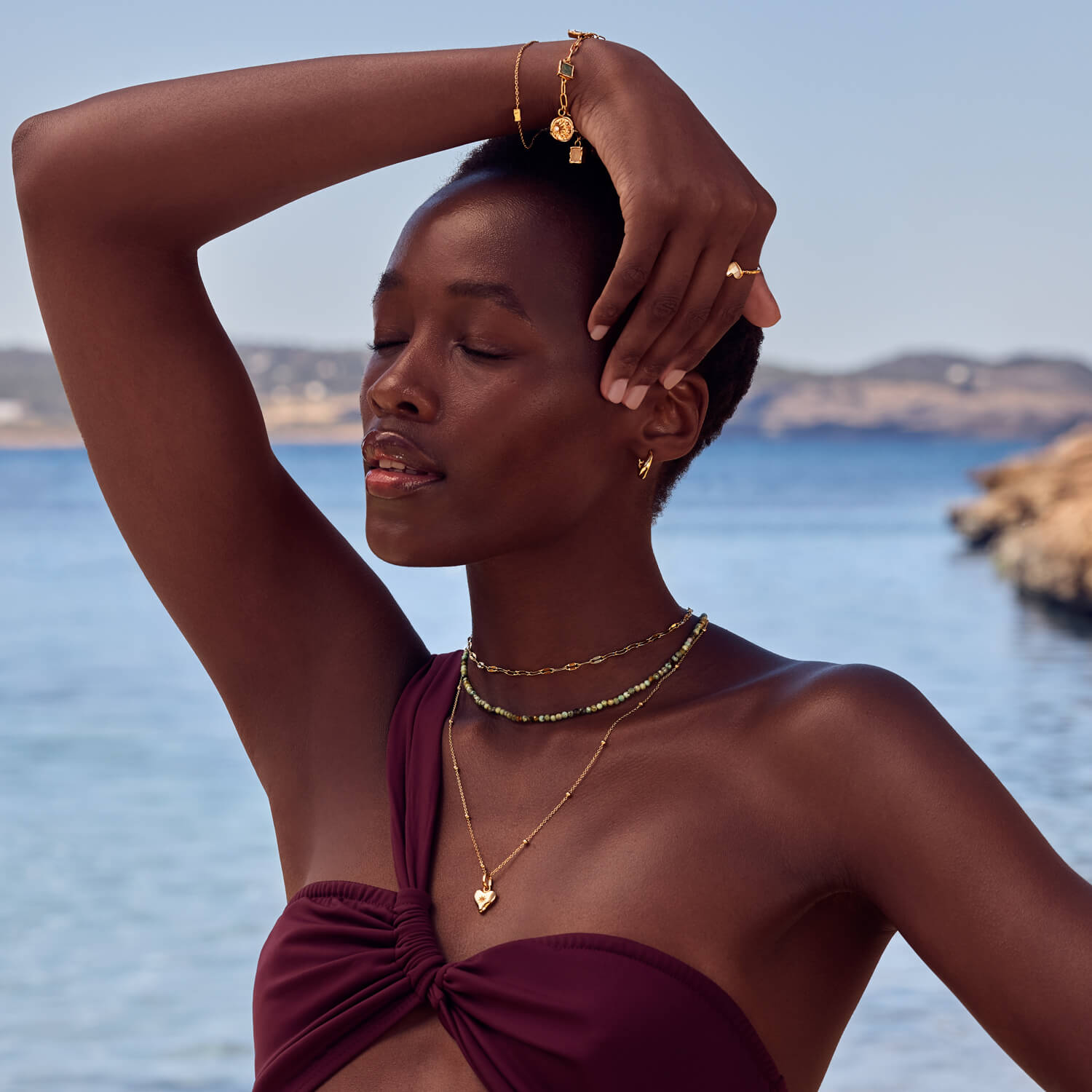 Channel 'golden goddess' with our Molten Heart Pendant. Custom-made with a unique molten shape, it features a dainty cubic zirconia star that catches the light perfectly. From seashells and starfish to semi-precious stones, stack with our collection of luxurious Ocean Charms to create your dream piece. A gift they'll love, guaranteed.